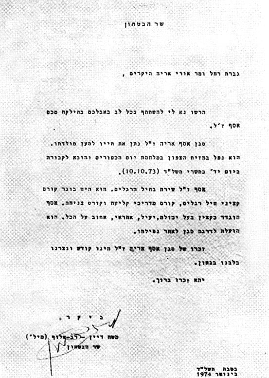 מכתב תנחומים, שר הביטחון