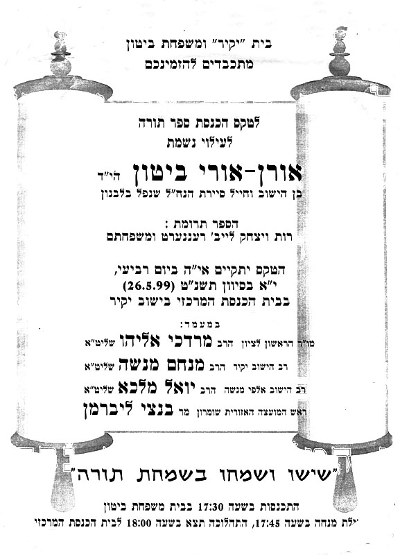 הזמנה לטקס הכנסת ספר תורה לעילוי נשמתו